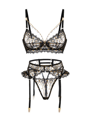 Elevate your allure with the Vanessa Golden Clover Lingerie Set. This exquisite three-piece set features a delicate black lace design embroidered with shimmering gold floral patterns, inspired by the elegance of a four-leaf clover. The set includes a supportive underwire bra, a matching thong, and a coordinating garter belt with adjustable straps, creating a flawless and seductive silhouette.