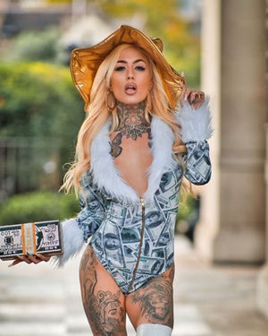 Slip into something saucy and play the role of a playgirl pimp! Embrace your bad side with this outfit that demands respect. Make them bow to your demands; you’re in total control when you’re wearing this ensemble! This sassy look features a long sleeved, body hugging romper with a gold zippered front that lets you show off as much as you like. Crafted in a unique green and white cash print that will keep you looking so money and finished off with a fluffy luxe white fur trim that lends a luxurious feel. Pair with our available gold pimp hat and some of your own gold chains and get ready to cause some trouble!