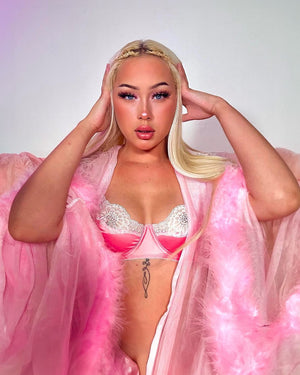 A stunning pairing of satin and lace adorn the supportive cups in this well-fitting underwire bra, as well as the thong panty that go with it. With fully adjustable shoulder straps and a hook and eye closure, this bra is sure to keep you and the girls in place and supported throughout the day or night, or both! The sweet lace detail at the front and back of the thong bottom accentuate your feminine assets in the best way, all while offering a seamless look under clothes. Or, better yet, pair this set with our favorite robe to entice and excite.