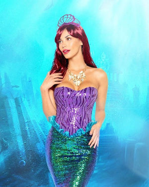 Entice anyone in your presence with this three piece mermaid costume that will make you look and feel as majestic as ever! With a glowing sequin skirt layered with Organza, a sexy lace up corset and a shell tiara to tie everything together, you will undoubtedly be the goddess of the evening.