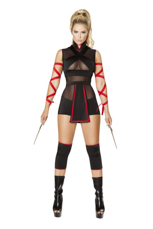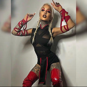Whether you’re looking for a sexy costume for your next Halloween party or a rave outfit with a fierce edge, our 3PC Ninja Striker outfit is just what you’re looking for. The main piece of this costume is a sexy black romper with cutouts and mesh detailing. The romper is accented by a waist wrap with front and black flaps that add that touch of true ninja style. Combined with the bright red arm straps, this sexy ninja costume is as fierce.