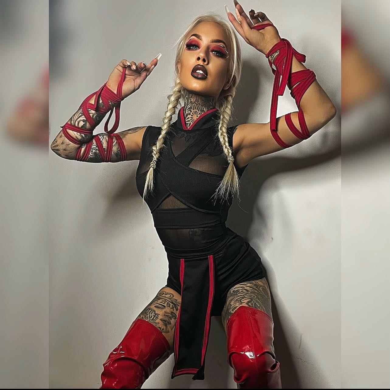 Our 3PC Ninja Striker outfit is available in sizes Small, Medium, and Large and comes in black with red accents and red arm straps.