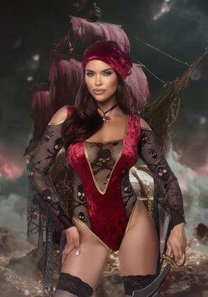 Set sail for a night of adventure and allure with the 3pc Treasure Chest Tease Halloween Costume, exclusively available at RaveFix! This sexy pirate-inspired costume includes a cozy yet daring knit romper, a stylish head scarf, and a playful toy sword — everything you need to channel your inner treasure hunter and steal the show at any Halloween party or rave.