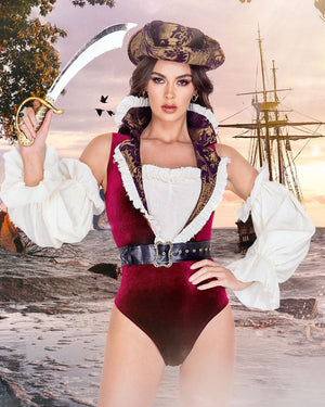Turn up the heat in whatever village you are plundering in a deluxe costume that simply can’t be ignored. This gorgeous costume features a show stopping and plush velvet bodysuit style romper in a rich wine color. The dramatic collar is made of a sumptuous looking brocade and is trimmed in romantic white lace ruffles. The added black belt with a vintage style buckle will define your waist and showcase your killer curves. Slide on the puffy white sleeves and perfectly coordinated purple brocade pirate hat for a head to toe ensemble. Finally, strap on your sword and you’ll be ready to take on any one!