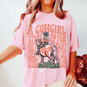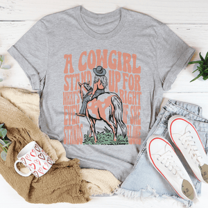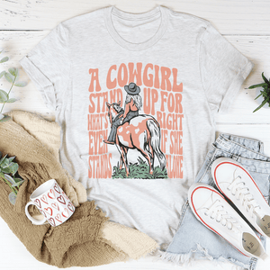 Let your t-shirt do the talking with a bold proclamation: "A Cowgirl Stands Up for What's Right, Even If She Stands Alone." Slipping on this shirt feels like a soft whisper against your skin, yet it screams determination with every thread.