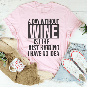 - Insta-Worthy Design: This tee features a minimalist wine glass graphic and the hilarious quote, "A day without wine is like... just kidding, I have no idea." Get ready for all the likes, comments, and #OOTD tags, babe!