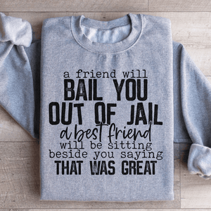 Celebrate friendship with style and grab your "A Friend Will Bail You Out Of Jail" sweatshirt now. Wear it proudly, and let the world know that you value the bonds of friendship, even when it comes to hypothetical bail scenarios. With this sweatshirt, you're ready to keep the good times rolling!.