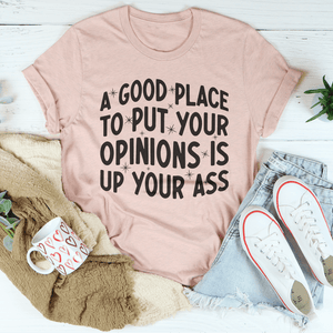 Introducing the ultimate fashion statement for the modern, sassy woman - the "(A Good Place To Put Your Opinions)" t-shirt! With its bold and unapologetic design, this trendy tee is perfect for the opinionated, free-spirited lady who's never afraid to express herself.