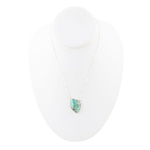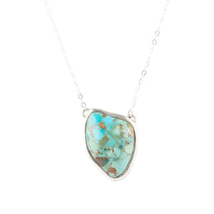 Make a statement with this stunning abstract turquoise and sterling silver necklace! Intricately crafted with genuine turquoise and sterling silver, this piece features a 16" chain with a 2" extender and lobster clasp closure. The pendant is 1" in length, .75" in width, and the entire necklace weighs 9 grams. The turquoise stone is an abstract shape set in a high polished sterling silver bezel-- finished and polished by hand for an extra special touch.