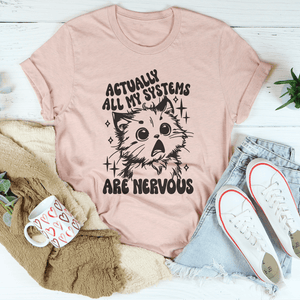 Embrace your quirks with our "Actually All My Systems Are Nervous" T-shirt. This clever tee is perfect for those who handle life's ups and downs with a healthy dose of self-aware humor. It's not just a T-shirt; it's a lighthearted acknowledgment of the anxiety we all occasionally face, delivered in a style that's both relatable and reassuring.