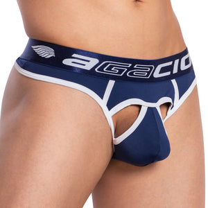 This thong features side cuts on the genetical area, leaving your thighs toned and defined. The thick elastic waistband accentuates your hips, creating a V shape on the back that highlights your best assets. The piping on the edge of the thong adds an extra touch of elegance to this already alluring piece of underwear. The men's enhancing underwear has separate clothing for the male anatomy attached with another stretchy cotton fabric to generate sensual pouch on the front for appealing the women in the crowd. With its breathable mesh and sheer fabric, the Agacio mens thong provides ultimate comfort and style. Whether you're looking to spice up your intimate moments or simply want to feel confident and attractive, this thong is the perfect choice for you. Show off your sensual side with the Agacio mens thong.