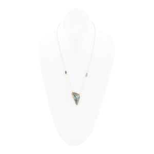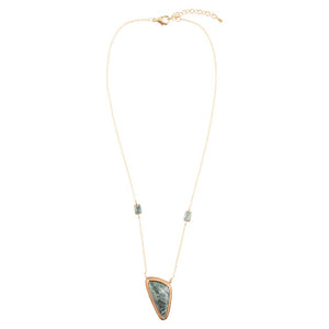 Indulge in the exquisite Alpine Green Seraphinite and Golden Necklace, featuring genuine stones set in gorgeous golden bronze bezels. This necklace, crafted and finished by hand, boasts a 20" + 2" extender and a stunning pendant measuring 1.5" in length and .9" at its widest point. The perfect combination of green and gold, this piece weighs a mere 13.2 grams. Elevate your style with the beauty and craftsmanship of seraphinite and bronze.