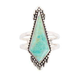 Unique and eye-catching, this Anemone Turquoise Sterling Silver Statement Ring captures the beauty of nature. Crafted and finished by hand with genuine sterling silver and turquoise, and featuring an oxidized finish. The ring is 1.25" in length, .5" in width, a bottom band width of 4mm, and an approximate weight of 6.2 grams. This statement piece is sure to be a treasured addition to any jewelry collection.