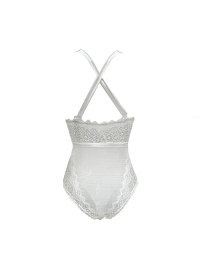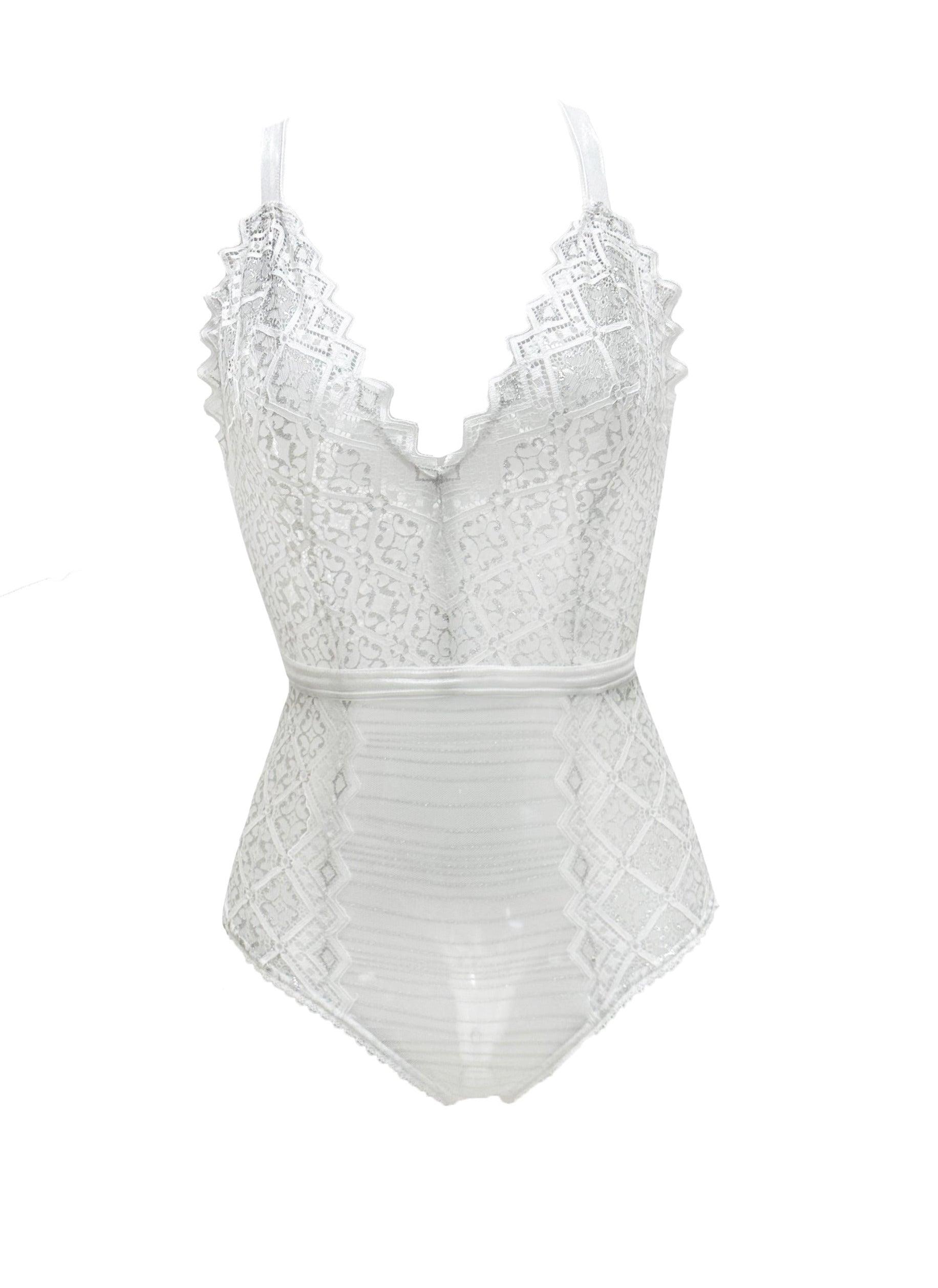 Made of luxurious metallic iridescent geometric lace, this bodysuit suit has a tulle-lined bodice with a V-neck and removable wide straps gives you the option to wear it crossed in the front or back, and the stripe mesh detail provides the necessary sheerness. Featuring wide elastic waistband and adjustable inner thighs hook and eye closure for easy undressing.