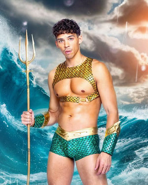 Unleash your inner Aquaman Hunk this Halloween with our stunning costume! Featuring a harness with buckle, studded belt, sleek shorts, and cuffs, this outfit ensures you make a splash at any party. Dive into the spotlight with this daring ensemble, perfect for an unforgettable night of fun and fantasy!