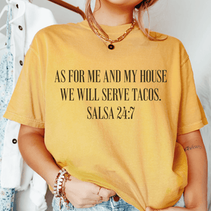 Meet the "As For Me And My House We Will Serve Tacos" Tee. With fabric as soft as a warm tortilla, this shirt becomes a wearable testament to your taco devotion.