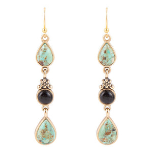 Barcelona Blue Turquoise and Black Onyx Linear Drop Golden Earrings