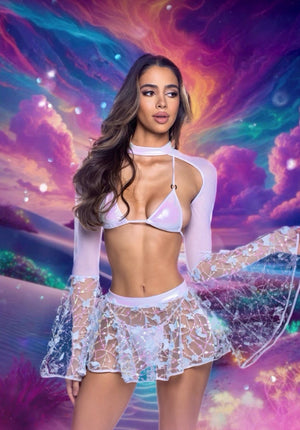 Get ready to dazzle at your next rave, festival, or pool party with the Bell Sleeve Shrug with Butterfly and Sequin Detail from RaveFix. Designed for the bold, the free-spirited, and the fashion-forward, this statement piece is the ultimate accessory to elevate your festival wardrobe. The flowing bell sleeves, adorned with intricate butterfly and sequin details, create a mesmerizing effect as you move to the beat. Perfect for adding a touch of sparkle and boho charm to your outfit, this shrug is versatile enough to wear over a bikini, bodysuit, or any rave-ready ensemble.