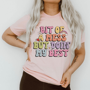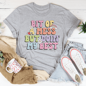 Introducing the one and only "Bit Of A Mess But Doin' My Best" statement t-shirt! Embrace the charming chaos that is life with this cotton-comfort gem, whispering soft secrets to your skin with each wear. The shirt captures your personality perfectly - a little bit scattered, but still unbeatably awesome.