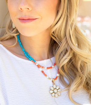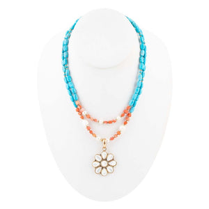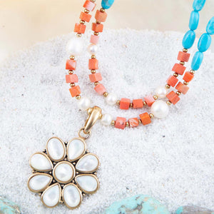 Hand-crafted with genuine bronze and adorned with exquisite mother of pearl, sponge coral, and turquoise magnesite, this hibiscus-inspired pendant is 1.25 inches wide and 2 inches long, including the bail. The necklace is made with two strands measuring 17 inches and 18 inches, with an additional 2 inch extender chain for a perfect fit. Total weight is 1.8oz. Rest assured that this pendant has been crafted to perfection with careful attention to detail.