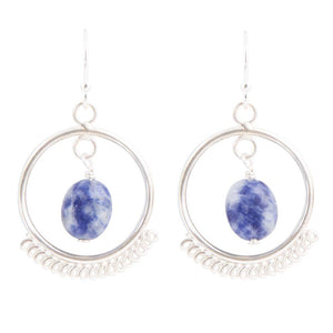 These stunning earrings feature a genuine kyanite bead suspended in the center of a silver hoop. The earrings are secured with a sterling silver fish hook closure and hang down 1.6 inches from the ear wire. Each earring weighs 2.5 grams and measures .8 inches at its widest point. Expertly handcrafted and finished, these earrings showcase a beautiful combination of blue and silver.