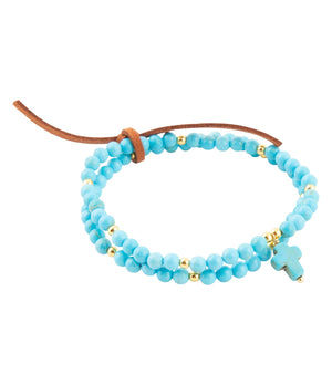 Hand-crafted and meticulously finished, this exquisite bracelet set features two strands of beautiful blue magnesite beads accented with a stunning blue magnesite cross charm and luxurious golden brass details. With each bracelet measuring 7.25 inches long and the charm measuring .5 inches in length with a maximum width of .3 inches, this set is sure to make a statement. The total weight of the set is 10.69 grams, making it a perfect accessory for any occasion.