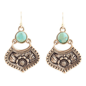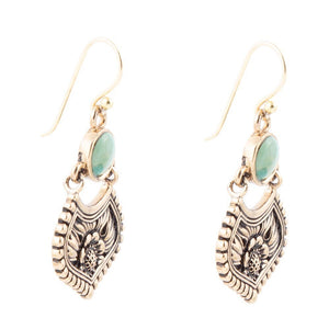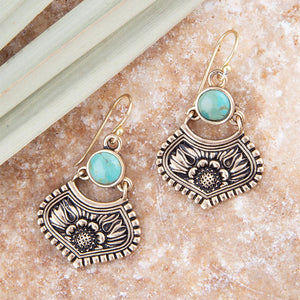 Experience the timeless elegance of these handmade Turquoise Flourish Golden Bronze Drop Earrings. Crafted with meticulous attention to detail, these exquisite earrings feature a stunning turquoise stone set in a bronze bezel. Weighing just 10 grams and measuring 1 inch wide, these earrings delicately hang 1.5 inches in length from the ear wire. Elevate your style with these one-of-a-kind statement pieces.
