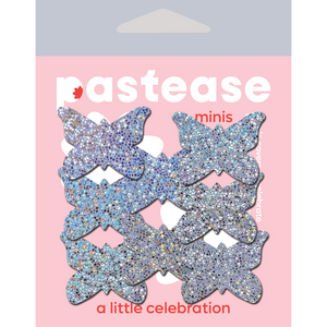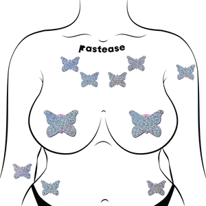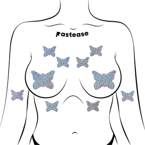 10 Mini Silver Glitter Butterflies Nipple and Body Pasties by Pastease® are hand-made in the USA of soft form-fitting material that forms seamlessly to curves and resists wrinkling over hardening nipples.