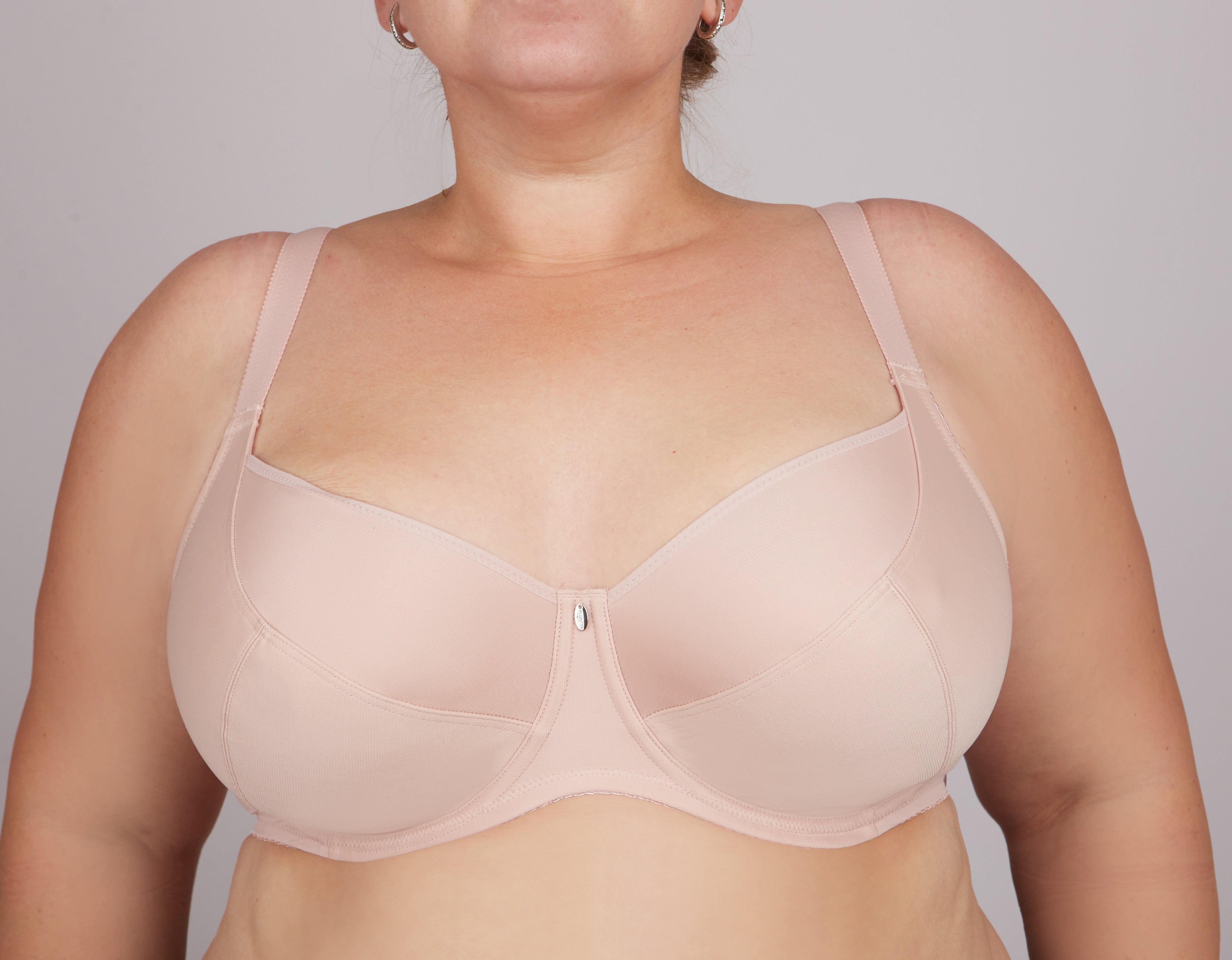 A classic bra made from non-elastic knit fabric and elastic fabric, with underwires. Soft cups with triple diagonal segmentation, on the wire. Straps are non-removable. This design provides a high degree of support due to the lower part of the cup, which performs a shaping function; it lifts, gathers from the sides, centers the breast, creating a round shape. A four-row closure allows for perfect adjustment of the bra's volume. The width of the strap tape and side parts of the band varies depending on the size. The larger the size, the wider the strap and side parts.