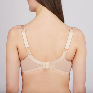 Minimizer bra with soft underwired cups. Made from elastic smooth fabric and micro-mesh. Cups feature a side shaping detail and cotton lining. Creates an impressive cleavage and visually reduces breast size.