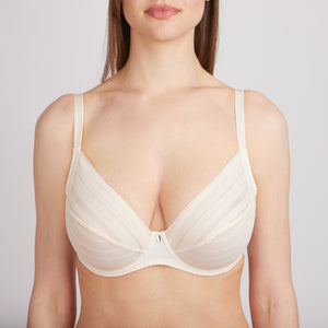 Milavitsa Bra 127630 made of elastic lace and elastic fabric, soft cup with side shaping detail. The side shaping detail – an element of the cup that transitions into the strap – helps create a beautiful breast shape, offering correction and support for larger, heavier sizes. The new series in the feminine "sport-chic" style features trendy flat elastic "band" lace (stripe design). The reinforced edge of the fabric allows for a range of bra and panty models without edge treatments, creating an invisible underwear effect and minimizing the visibility of lingerie lines under clothing.