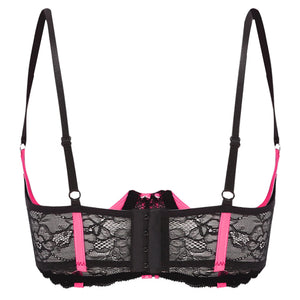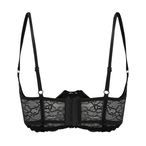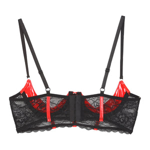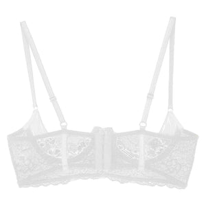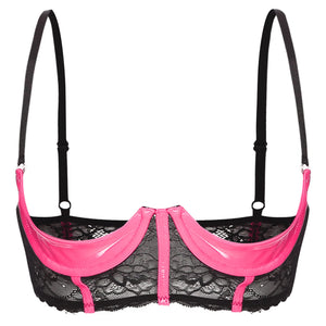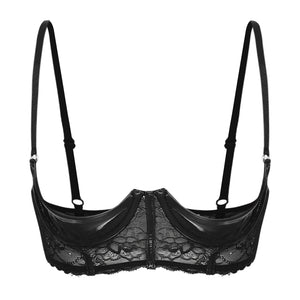 Indulge in elegance with this exquisitely crafted sheer lace bra, designed to enhance your natural shape with a touch of bold sophistication. The intricate floral lace detailing, combined with sleek patent leather accents, creates a striking contrast that exudes confidence and allure.