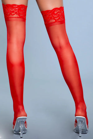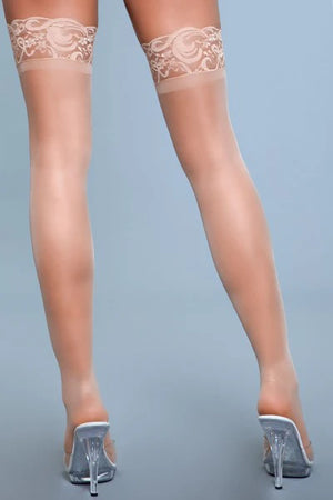 - Style: Classic sheer thigh-high stockings with floral lace band