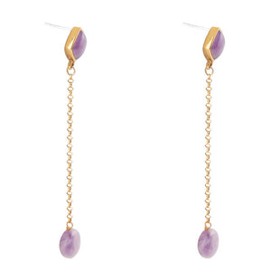 - Genuine amethyst stone is placed in bezel, and has an amethyst stone hanging from the bezel from a golden bronze chain. Earrings hang 3.4" from sterling silver post. Each earring weighs 3.5 grams. Colors are purple and gold. Materials are amethyst and bronze. Crafted and finished by hand. Transform your look with the captivating beauty of genuine amethyst and golden bronze in these handcrafted earrings! The stunning purple hues and intricate design will make you feel like royalty. Plus, with lightweight materials and a comfortable sterling silver post, you can wear them all day without any discomfort. Add a touch of elegance and luxury to any outfit with these unique earrings.