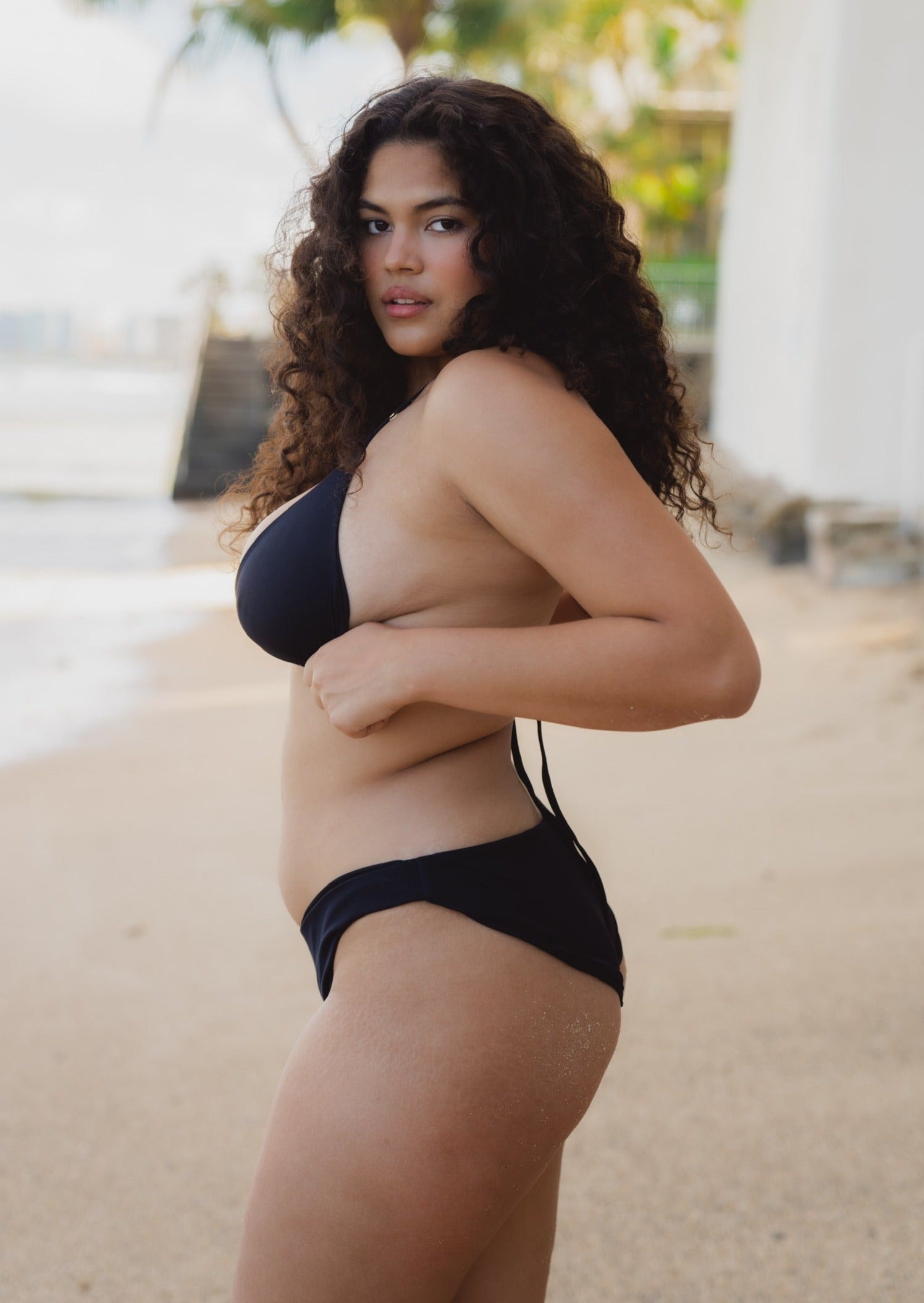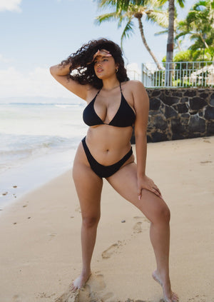 Wearing the Nalani Triangle top and Cheeky Bottoms x Black Eco-Rib in Size XLarge