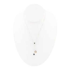 Indulge in the luxurious beauty of this hand-crafted Circle Two-Toned Grey Labradorite Sterling Silver Necklace. Each genuine labradorite stone is carefully placed in a sterling silver bezel, with a golden bronze circle delicately hanging from the center stone. The necklace boasts a perfect balance of silver and bronze tones, measuring 16" in length with a 2" extender. The largest stone is .2" wide, and the entire necklace weighs just 4 grams. Own a unique piece of artisan jewelry that exudes elegance and charm.