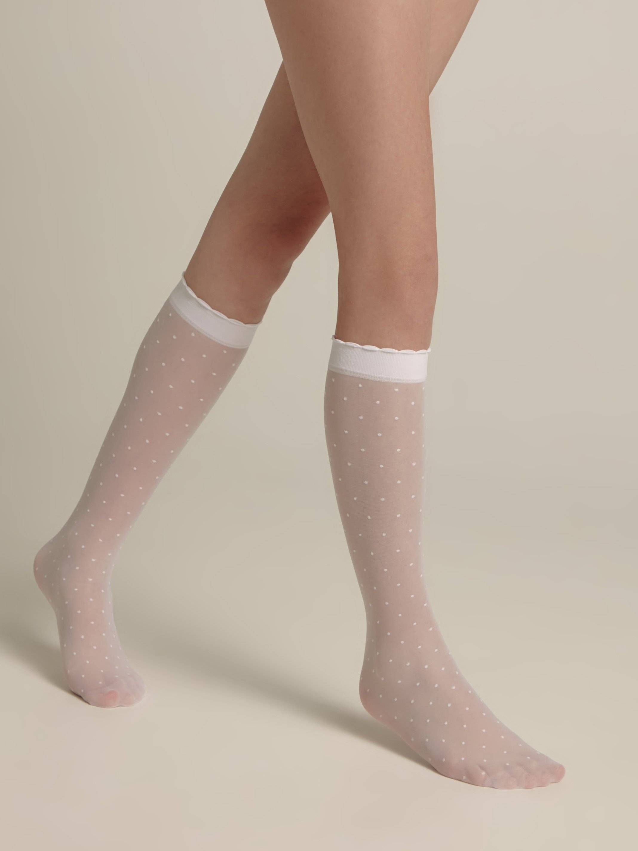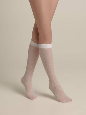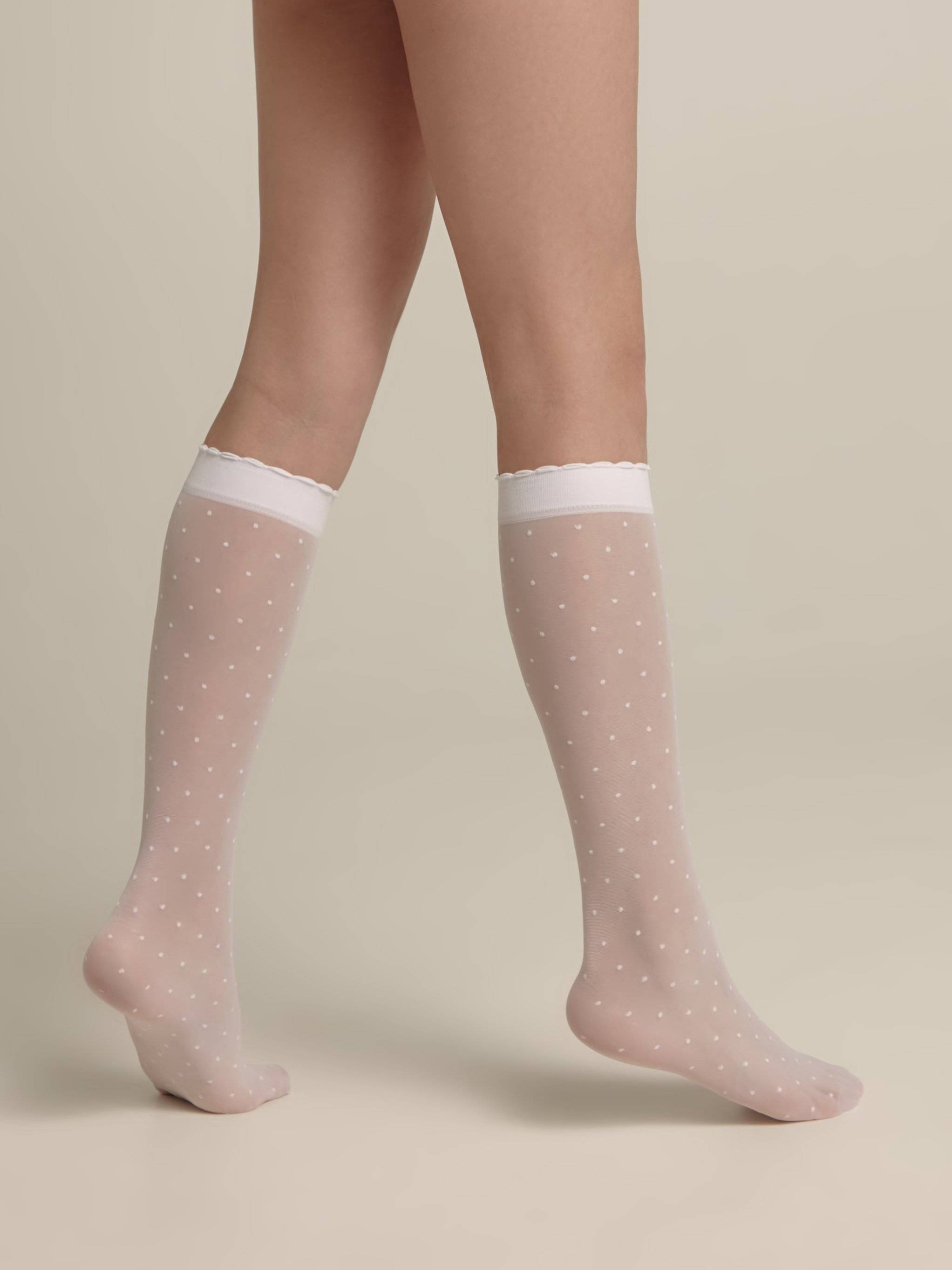 Thin and elastic knee-highs with a "dots" pattern, DOTS, will look great in both a girl's everyday and festive ensemble.