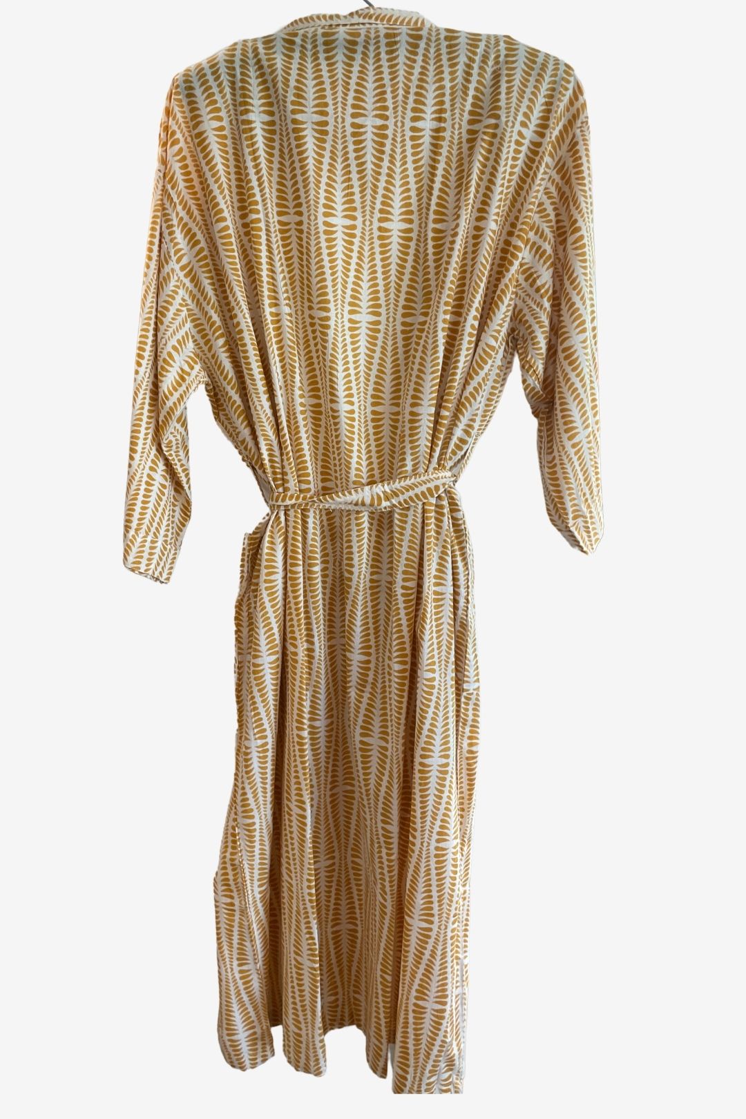 Pure Cotton Kimono with Hand Block printing. Pure cotton is most gentle on the skin and also easy to care. Gorgeous colors with Azo-free dyes for a delicate look inside and outside your home. Twin Pockets. Soft Solid Cotton piping detail