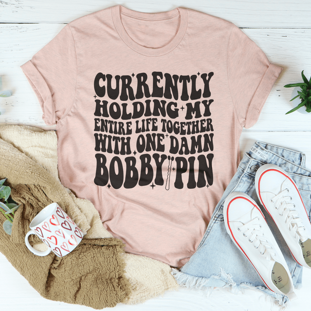 Introducing the ultimate "Currently Holding My Entire Life Together With One Damn Bobby Pin" tee - This trendy graphic t-shirt is perfect for those days when you need a little extra motivation and a touch of self-deprecating humor to keep going.