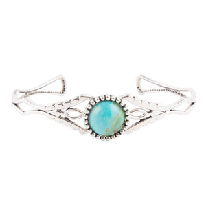 This Dainty Turquoise Cuff Bracelet is perfect for making a subtle yet eye-catching statement. Crafted from genuine turquoise and sterling silver, this beautiful bracelet features a solid circle of turquoise that is 2/3" in diameter. It is designed to fit most wrists with a 2.5" inner diameter and is the perfect accessory for any outfit.