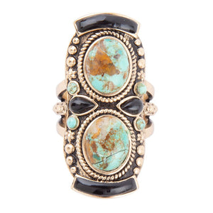 Make a statement with the Double Up Turquoise and Onyx Ring! Featuring genuine turquoise, onyx and bronze that are carefully crafted and finished by hand, this 1.5 inch ring in length and .6" in width. The ring weighs 11 grams and is sure to wow with its stunning turquoise, black and gold-tone bronze colors. Stones are placed in bronze bezels for a truly unique look - try it on today!