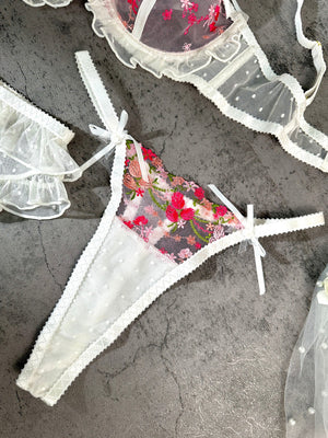 Unveil your inner elegance with the Emily Blossom Kiss Lingerie Set. Designed with soft, delicate floral embroidery and luxurious lace, this set exudes a perfect blend of charm and sophistication. The balconette bra with delicate ruffle details and adjustable straps ensures a flawless fit, while the matching thong with garter straps adds a playful yet sensual touch. The soft, breathable fabric ensures comfort, making this set ideal for any occasion, from a romantic evening to a special moment of self-love.