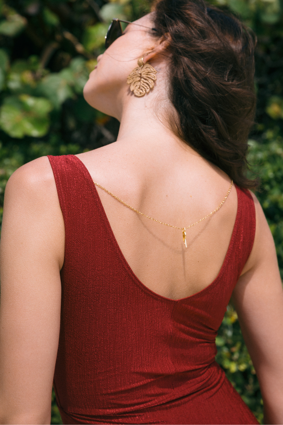 She's back!! The Emma Beachwear Dress, a versatile and luxurious addition to your summer wardrobe. This stunning dress is crafted from a high-quality burgundy jacquard Brazilian Lycra fabric, offering a glamorous look that can be dressed up or worn casually. The sophisticated knot twist in the center and a chic front open cutout add a touch of elegance and style, while the gold logo necklace that dangles in the back provides a hint of luxury. Perfect for any beach or poolside occasion, this dress is sure to make you shine.