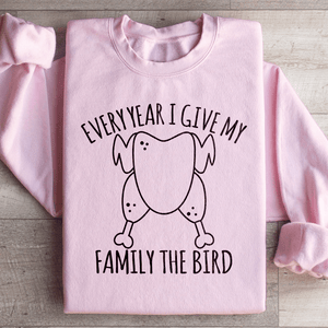 The sweatshirt features the phrase "Every Year I Give My Family The Dinner" in a warm, inviting font, capturing the essence of your loving dedication to creating memorable meals. It's a wonderful choice for holiday cooking, family reunions, or any occasion where food and love are shared.