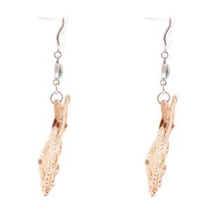 Experience the beauty of nature with these stunning fan earrings made of genuine turquoise and rattan. The rattan fan dangles from a sleek sterling silver structure and is suspended 2.9" from a secure silver post. These earrings are 2.5" at their widest point and weigh 3.3 grams each. The vibrant colors of tan, blue, and silver will add a touch of elegance to any outfit. Handcrafted and carefully finished, these earrings are a testament to the value of artisanal craftsmanship.