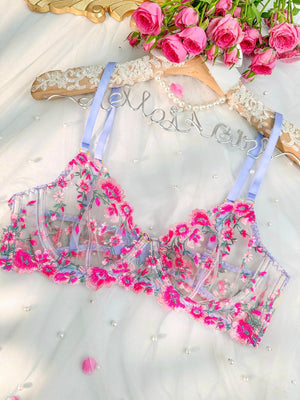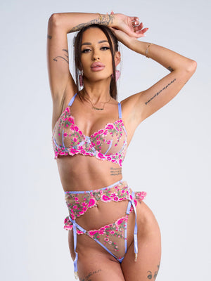 This lingerie masterpiece features vibrant pink floral embroidery that radiates with a passionate allure, elegantly paired with soft lavender straps and trims. The delicate lavender pendants add a touch of whimsical charm, creating a harmonious blend of bold color and gentle sophistication. Each detail weaves a story of romance and elegance, making this piece a captivating celebration of sensuality.🌸💜