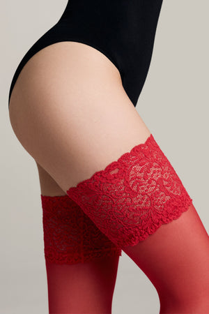 Sheer stockings AMOUR with a wide lace top are the perfect choice for stylish looks and absolute confidence. Crafted from multifilament yarns with a natural silk effect, they offer exceptional comfort and elegance.