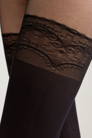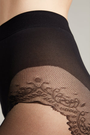 Dense fantasy tights DELIGHT with a “lace stocking imitation” pattern and shaping panty effect. Tights DELIGHT are comfortable, elegant, and designed to highlight feminine curves.