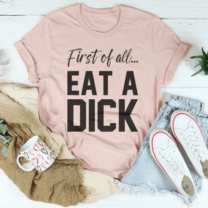 Add a splash of playful cheekiness to your wardrobe with our "First Of All, Eat A Duck" t-shirt. This quirky tee is perfect for those who love a good pun and enjoy a humorous twist on expressions. Whether you're out with friends, at a casual dining spot, or just enjoying a day in the park, this shirt is sure to quack up a conversation.