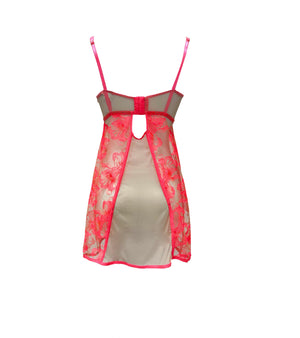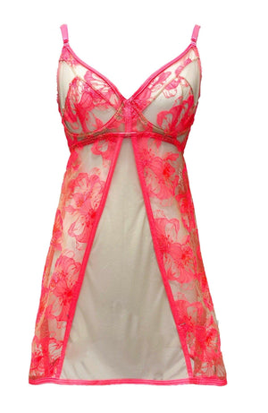 Experience a flirtatious night in our Fluor Nightie. This sexy and transparent piece features bright pink embroidered tulle, an underwire bust for support, and a bra hook back. The A line design flatters any figure for a confidently alluring look.